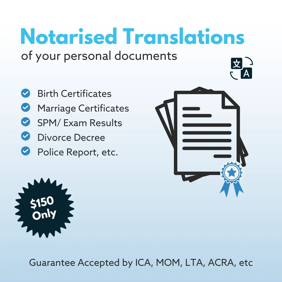 LOWEST PRICES: We specialise in translating, certifying, and notarising Malaysian documents for official use. If you find a cheaper service in Singapore, we will refund the difference.